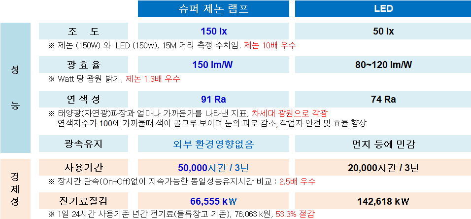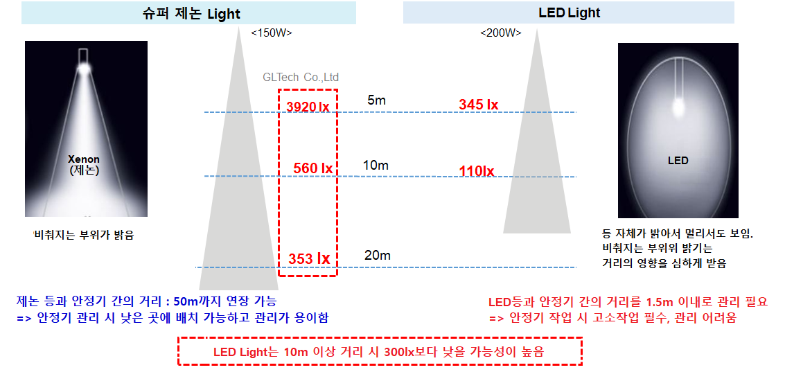 슈퍼제논램프 는 10m 이상의 높이에서도 조도가 높고, 보수하기가 용이하다.