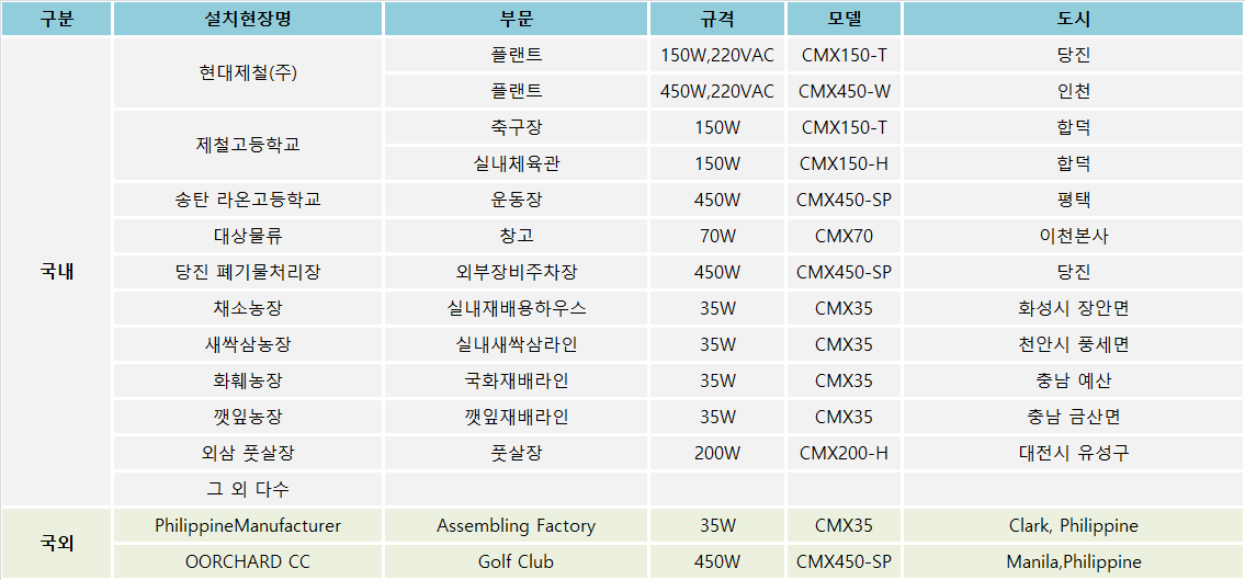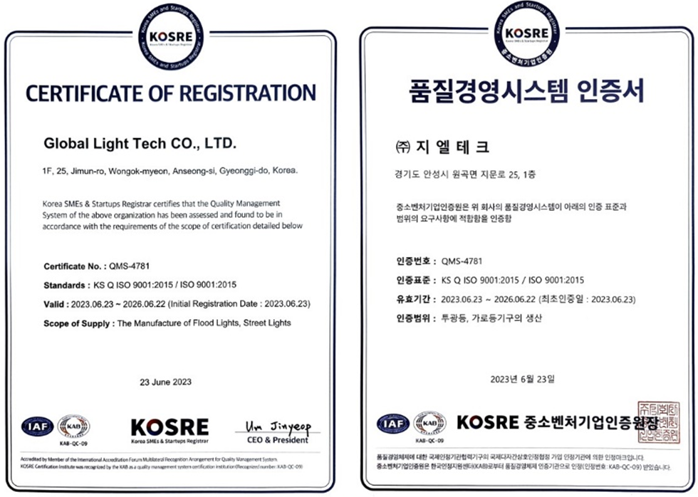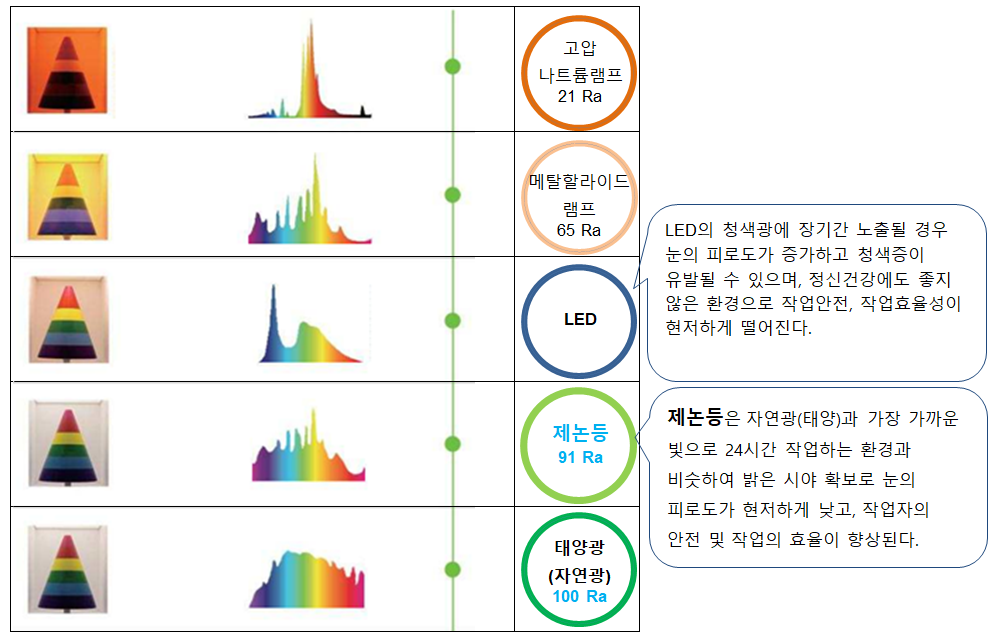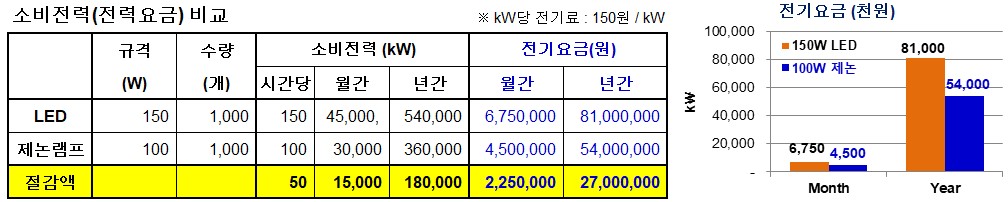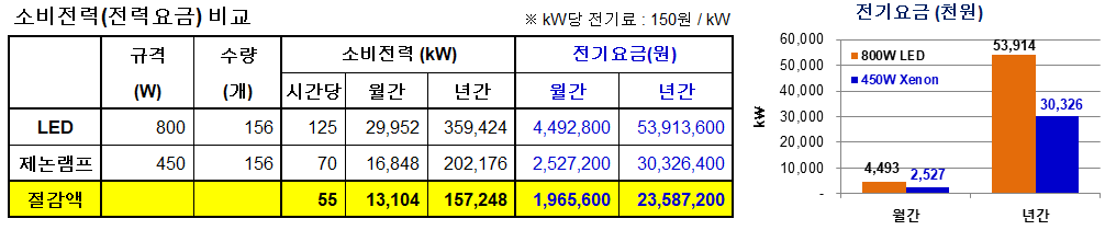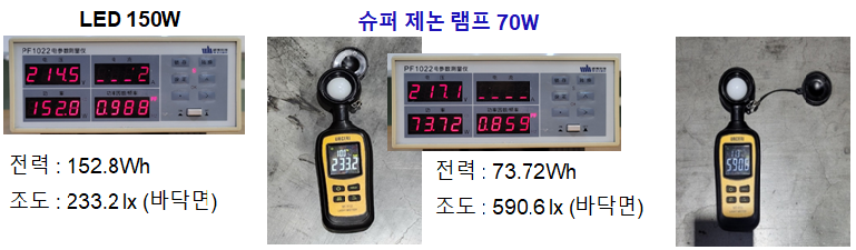 제논 램프로 세상을 밝히세요 왜 슈퍼 제논 램프인가? 더 밝고, 더 오래 사용하고 에너지 절감이 탁월한 슈퍼 제논 램프 ※ 조달청에서 ‘GLTech’로 제논 조명 제품 검색 가능 슈퍼 제논 램프 vs. LED 램프 슈퍼 제논 램프설치 위치가 10m 이상에서도 조도가 높고 유지 관리가 용이함 탁월한 성능전력 사용량 50% 수준 절감밝기는 2배 이상 인체에 안전 : 태양광과 유사낮은 보수 비용 : 램프만 교체함으로써 유지,보수비용 절감 조도 비교 : 제논 램프와 LED 비교 전력 소비량 절감 설치 장소와 조건에 따라 약 30~50%의 전력 절감 효과가 있음 ◎ ‘B’ 기업의 물류센터 : 전력 사용량 53% 절감 현장 : 이천 물류 회사 (대한민국)설치 면적 : 40,000㎡설치 일자 : 2023년 1월 6일이전(LED)과 동일하게 9m 높이에 설치1일 24시간 사용 기준 바닥 조명 : 9m 높이에 설치된 LED와 슈퍼 제논 램프 비교 ※ 물류 창고 바닥 조도 안전 기준 : 300럭스(lx) 이상 LED등을 제논 램프(70W)로 교체 작업 중 슈퍼 제논 램프는 기존 LED에 비해 조도가 개선되었고, 전력 소비를 2배 이상 절감되었음. LED 광원의 눈부심은 눈의 피로를 가중시킴 LED의 광효율과 조도는 시간이 지남에 따라 감소 ◎ 골프장 : 소비전력 34% 절감 1일 8시간 사용 기준 ◎ 가로등 : 소비전력 33% 절감 1일 10시간 사용 기준 슈퍼제논 램프 : 연색성이 높아 더욱 안전한 환경을 제공합니다. ※ 연색성조명이 햇빛(자연광)에 얼마나 가까운지를 나타내는 지표연색성 지수가 100에 가까울수록 태양광과 더 유사하며, 색상이 균일하고 자연스러움. 눈부심과 조도 슈퍼제논 램프눈부심이 적고실제로 조명이 비추는 표면의 밝기가 뛰어남 LED 램프 : LED의 빛 자체는매우 밝지만, 실제 비춰지는 표면의 밝기는 상대적으로 낮음.슈퍼 제논 램프 : – 광원 자체는 눈에 띄게 밝지 않지만, 조사 면의 밝기는 매우 우수. – 불필요한 외부로의 빛 누출을 최소화하여 빛 공해 및 민원 감소 제품 종류 및 규격 1. 가로등 (나라장터에 제품 등록됨) 1-1) 가로등 1-2) 태양광 가로등 제품명 : 35W(CMX35-SSL), 55W(CMX55-SSL) 탁월한 성능전력사용량 30~50% 감소램프만 교체, 유지보수 비용이 크게 절감.하루 10시간 충전 후 48시간 동안 조명 제공 태양광 충전을 못할 경우 충전용 배터리의 용량에 따라 사용시간 결정LED 70W 보다 제논등 35W 가로등을 사용할 경우 소형 배터리를 사용하게 되므로 3~4배 경제성이 있음. 2. 투광등 2-1) 스포츠/조명타워/창고용 2-2) 공장/창고용(실내외용) 2-3) 공장/창고용(실내용) 3. 스포츠 조명 : 운동장 / 골프장 4. 탐조등(서치라이트) : CCTV / 보안 / 군사용 5. 방폭등 : 화학 공장 및 관련 시설 설치하여 2년 간 사용 결과 문제가 없어서 공장 전체로 확장 진행 중 슈퍼 제논 램프 150W ('K' 제철) 12개월 사용 시 열과 먼지에 의해 손상된 LED등 상태 LED 150W ('K' 제철) 'K' 제철 슬러지 공장 설치 후의 사진 'K' 제철 고로 공장 설치 전/후 사진 비교 설치 현장의 성능 비교 실외 스포츠 실내 스포츠 공 항 항 구 제논 램프의 적용 심해 어업 선박 / 화물선 공장 / 창고 설치 장소 설치된 사진 인증서 KC안정인증서 특허 품질경영시스템 인증서 전파인증서